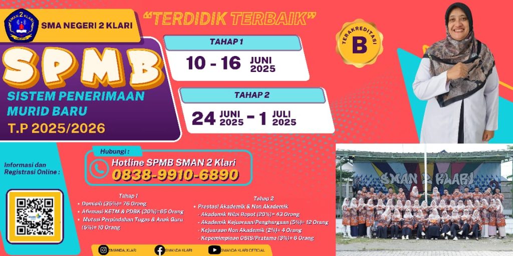 Dalam rangka menyambut tahun ajaran baru 2025/2026, SMA 2 Klari membuka kesempatan bagi lulusan SMP/MTs untuk bergabung dan tumbuh bersama dalam lingkungan pendidikan yang unggul, berkarakter, dan berwawasan kebangsaan. 📆 Jadwal SPMB 2025 Jawa Barat SPMB SMA Tahun 2025 di Jawa Barat dilaksanakan secara online dan bertahap sesuai dengan ketentuan dari Dinas Pendidikan Provinsi Jawa
